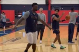 害搁那聊啥呢!训练后普尔与锡安继续讨论 两人拿球连说带比划