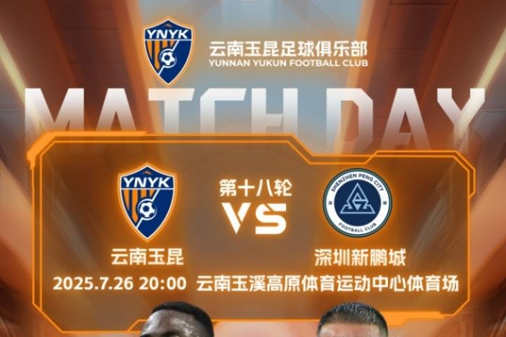 体育资讯07月26日讯 20点中超第18轮,云南玉昆主场迎战深圳新鹏城。